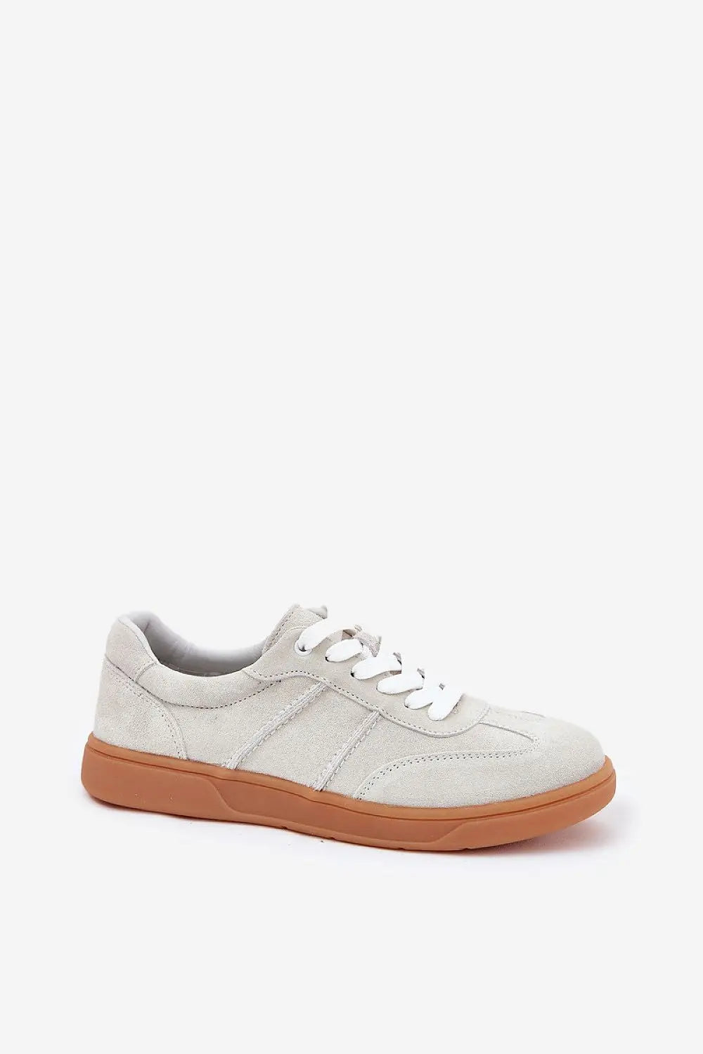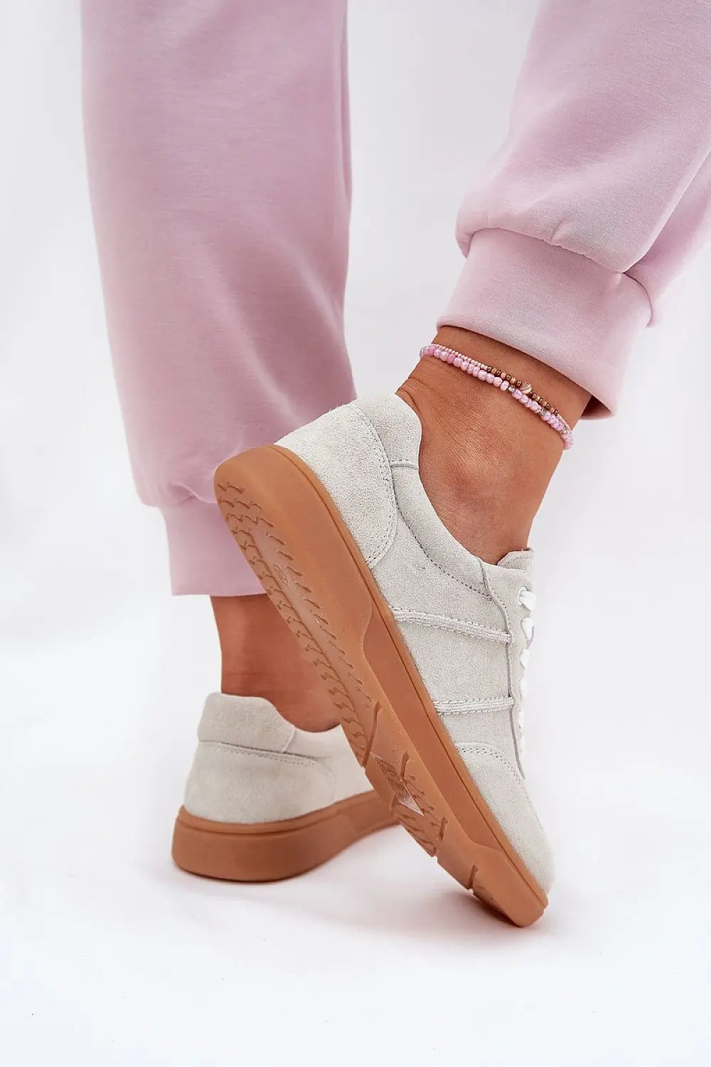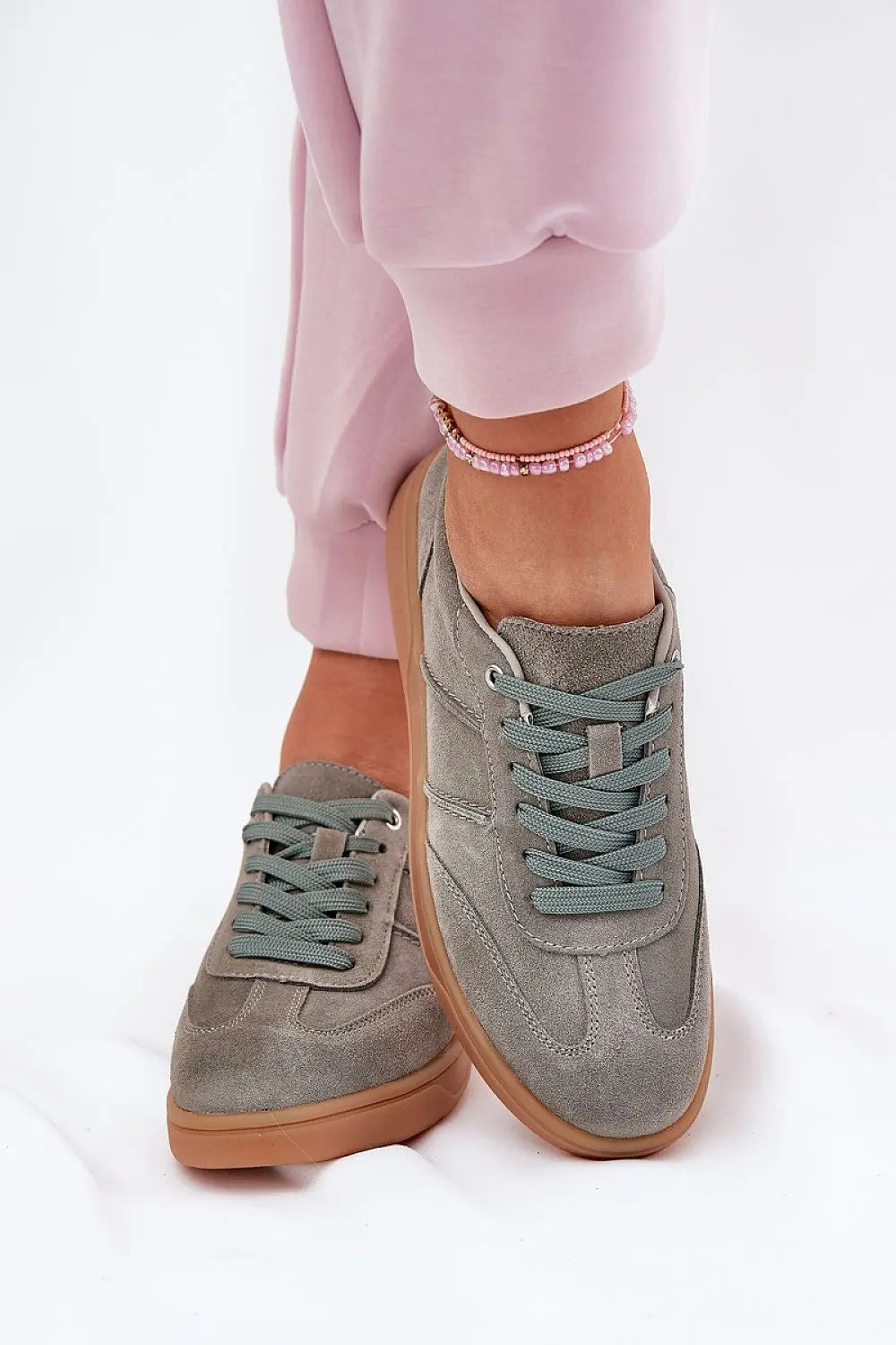 Low women's sneakers made of natural suede. The toes of the shoes are rounded. Classic lacing allows for a perfect fit to the width of the foot, and the leather insole provides comfort and cushioning. Stylish and versatile, they go perfectly with various stylings.