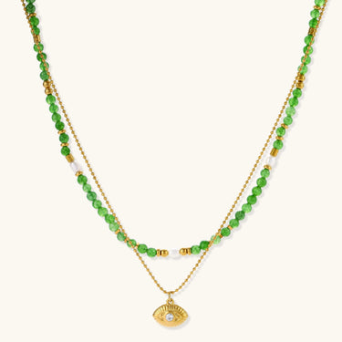 Green stones—believed to amplify protection—layer perfectly with this golden eye pendant that's giving main character energy.