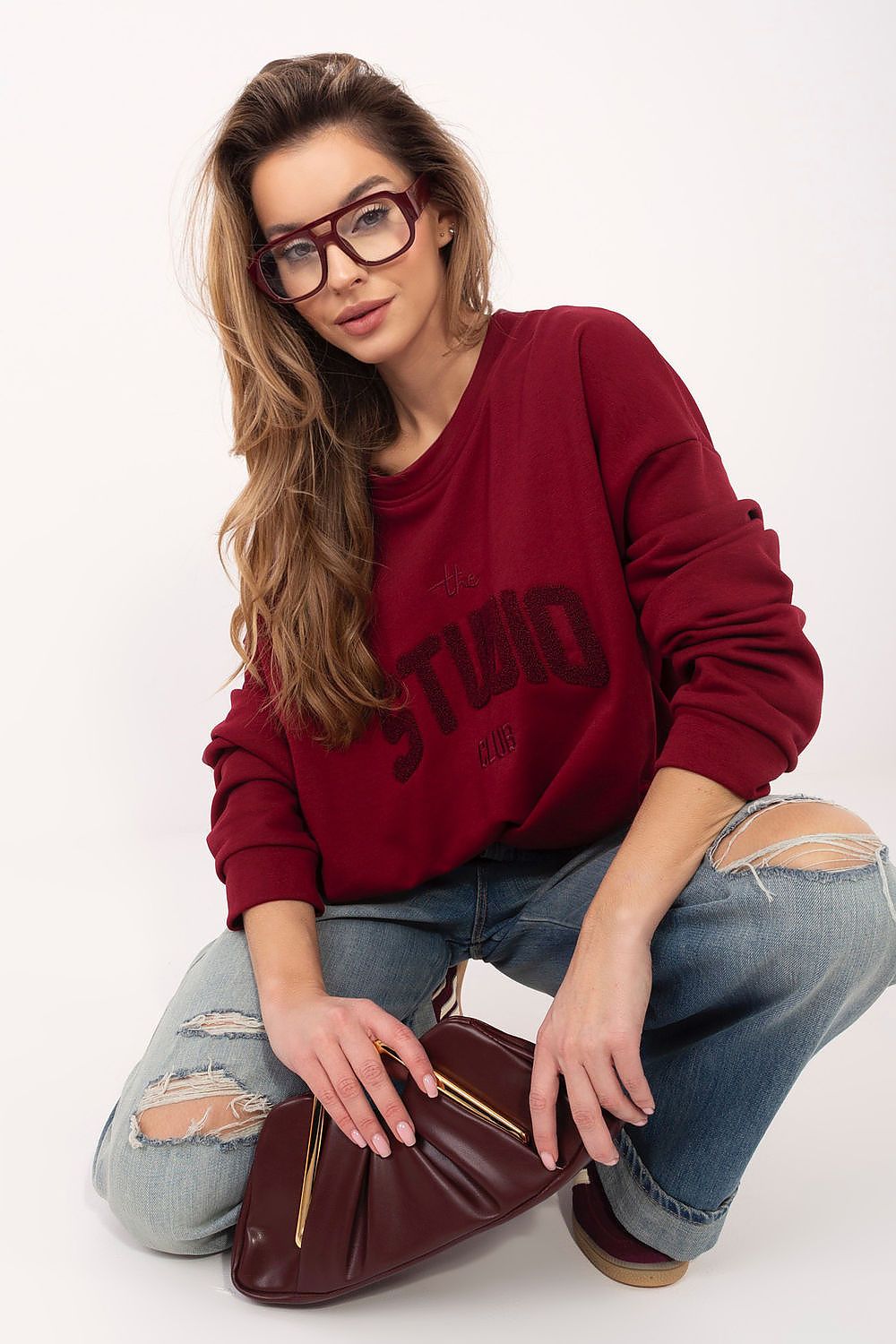 Stylish women's oversized blouse, perfect for everyday casual styling. Loose fit provides freedom of movement and high wearing comfort, while the standard length makes the blouse fit nicely on the silhouette and goes well with many outfits. The model has a classic round neckline and long sleeves, making it perfect for cooler days. The dominant elements of the design are embroidered and embossed inscriptions on the front, giving the blouse a fashionable, modern character. Made of high quality cotton, the blouse is soft, skin-friendly and provides comfort throughout the day. The model without fastening emphasizes the casual, sporty style, making it perfect for pairing with both jeans and leggings or sweatpants.