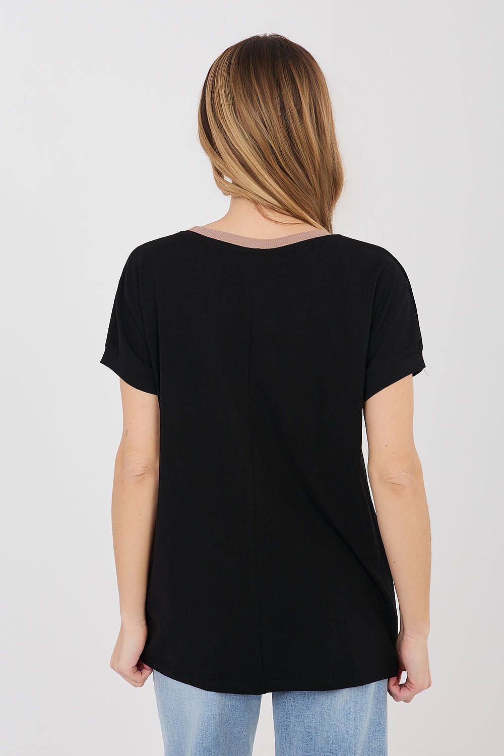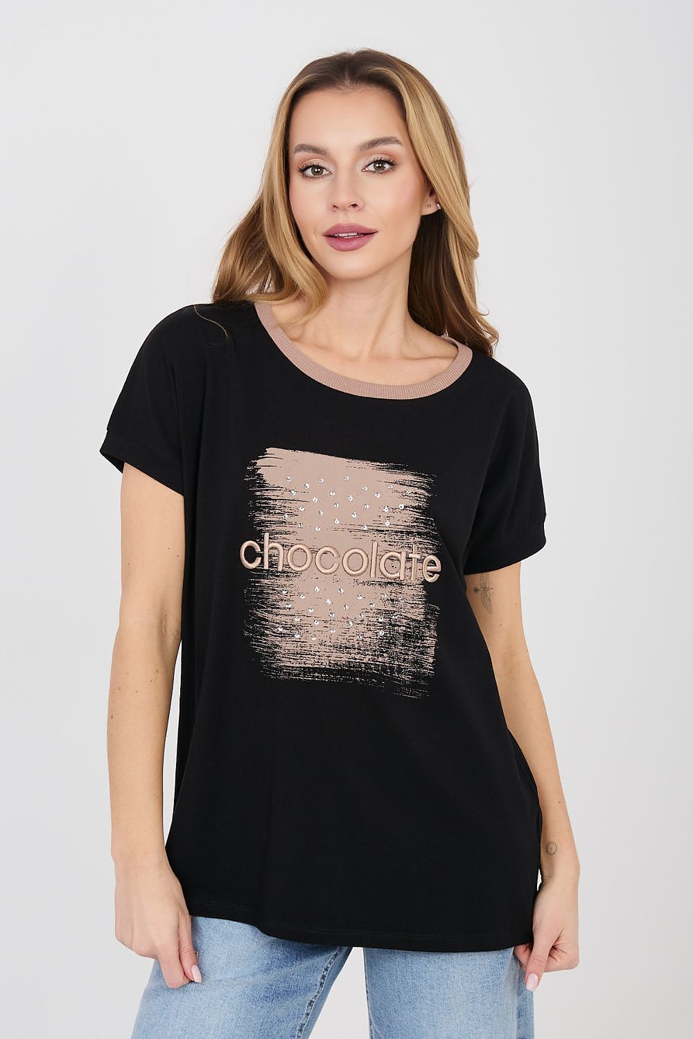 Stylish and comfortable daily blouse in a casual edition, perfect for everyday wear. The model has a classic, round neckline finished with a contrasting trim, which gives a subtle character and emphasizes the details of the outfit. The blouse is decorated with an embroidered sequin inscription on the front, serving as an eye-catching accent and the dominant pattern of the entire model. Short sleeves and standard length provide comfort while the loose, everyday cut fits into the casual style. Made of high-quality cotton fabric with elastane, it is soft, pleasant to the touch, and slightly elastic, ensuring comfort throughout the day. The model does not have a fastening, which emphasizes the simplicity and functionality of the design.