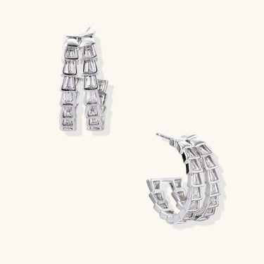 Architectural baguette-cut zirconia climbs these white gold-plated hoops in pure Art Deco energy.